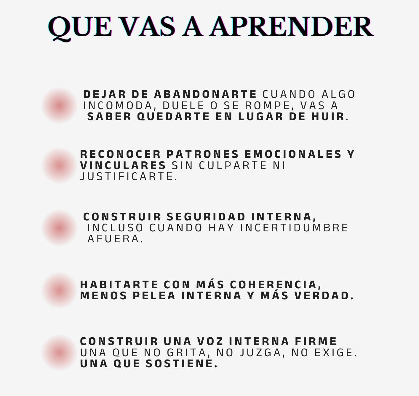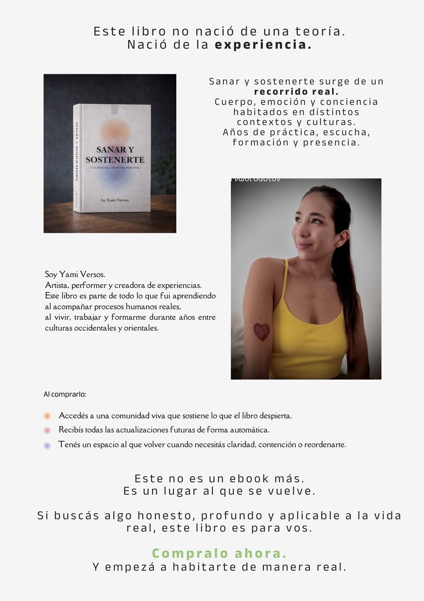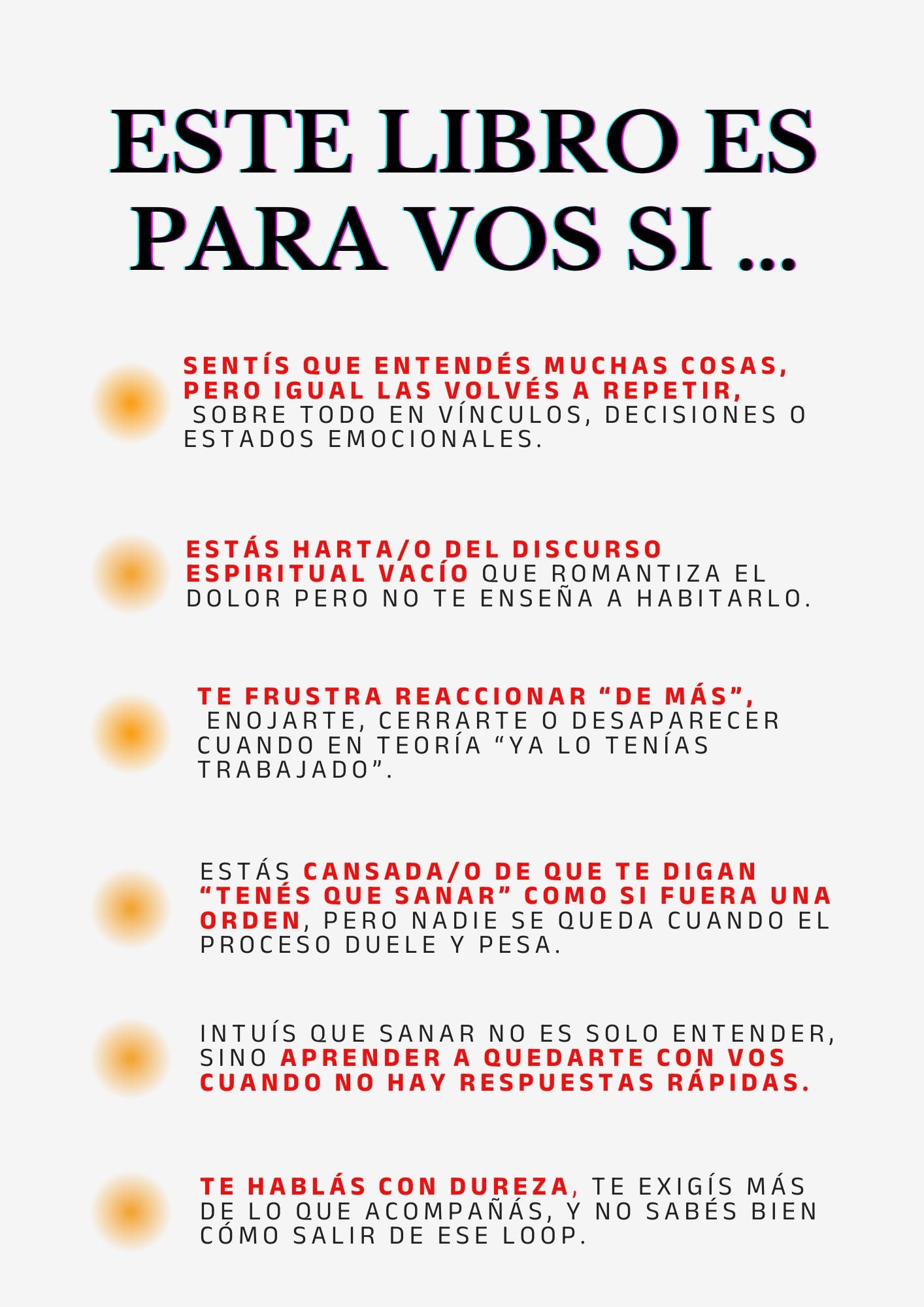 te enseña a quedarte con vos, incluso cuando no hay respuestas. te da herramientas para sanar de manera sostenida en el tiempo y sintiéndote acompañada/o. Ademas de poder recibir todos los updates que esten destinados a este libro.